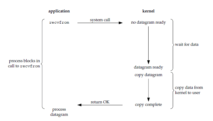 - 同步 I/O: 应用进程在调用 recvfrom 操作时会阻塞。