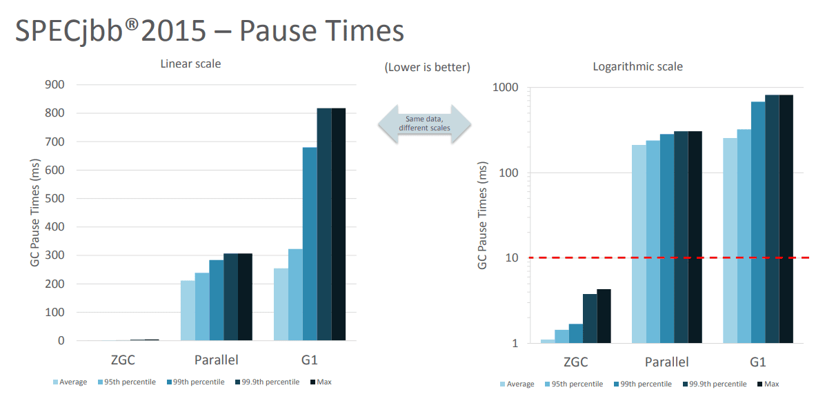- 当前只支持 Linux/x64 位平台 停顿时间在 10ms 以下,10ms 其实是一个很保守的数据,即便是 10ms 这个数据,也是 GC 调优几乎达不到的极值。根据 SPECjbb 2015 的基准测试,128G 的大堆下最大停顿时间才 1.68ms,远低于 10ms,和 G1 算法相比,改进非常明显。