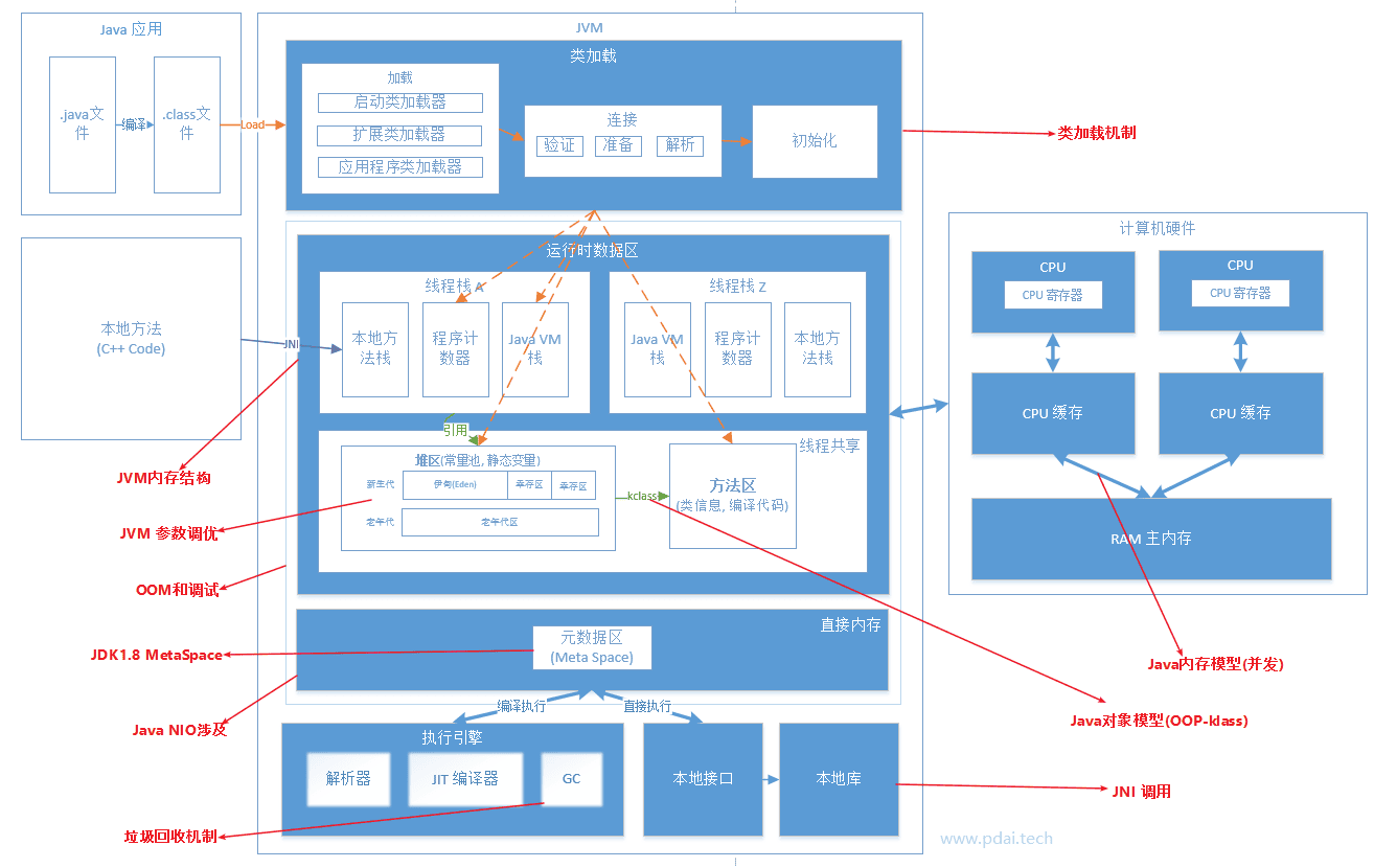 不同的虚拟机实现方式上也有差别,如果没有特别指出,这里的JVM指的是sun的HotSpot;不同的JDK版本略有差别,这里主要以1.8为主,具体差异请看各个章节中详解。下图主要表示的逻辑关系,用来将所有知识点放到一张图里,帮助你理解。