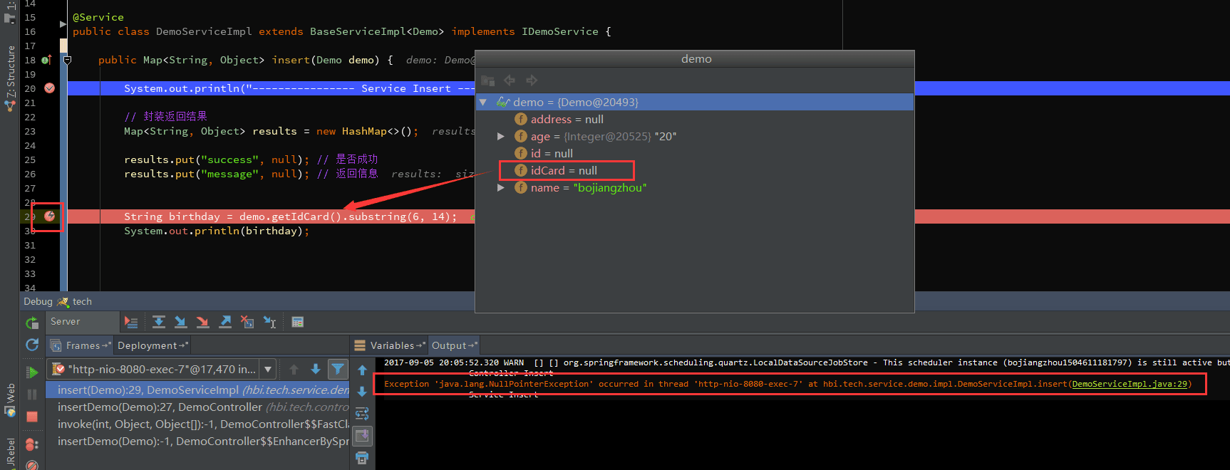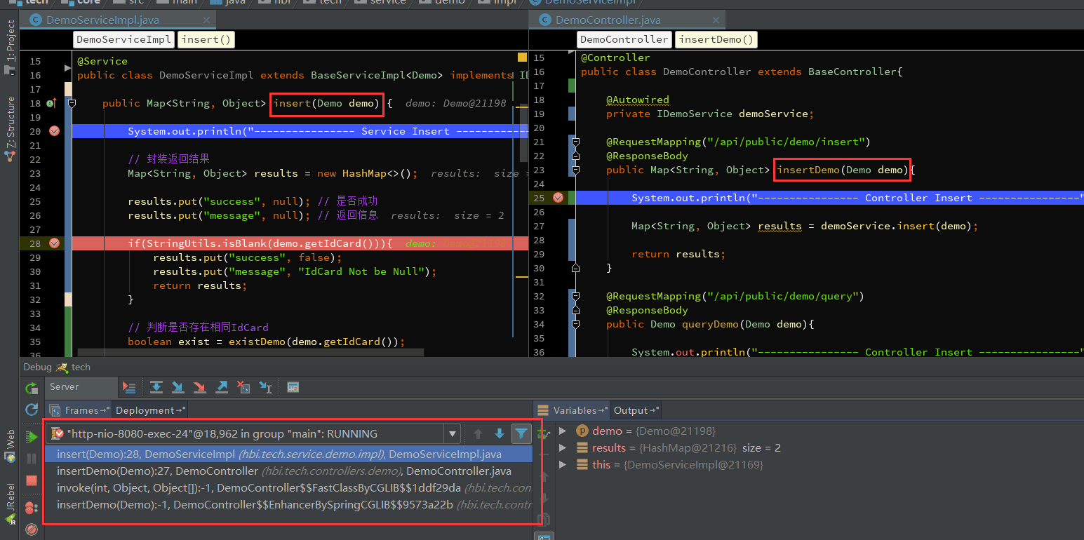 - 首先认识下这个方法调用栈 ,如图首先请求进入DemoController的insertDemo方法,然后调用insert方法,其它的invoke我们且先不管,最上面的方法是当前断点所在的方法。