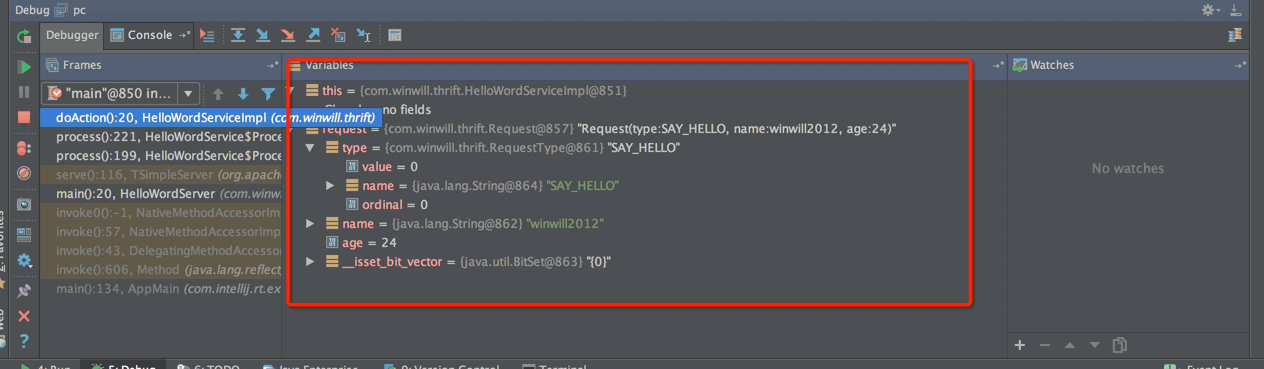在Debug过程中,跟踪查看变量的变化是非常必要的,这里就简单说下IDEA中可以查看变量的几个地方,相信大部分人都了解。