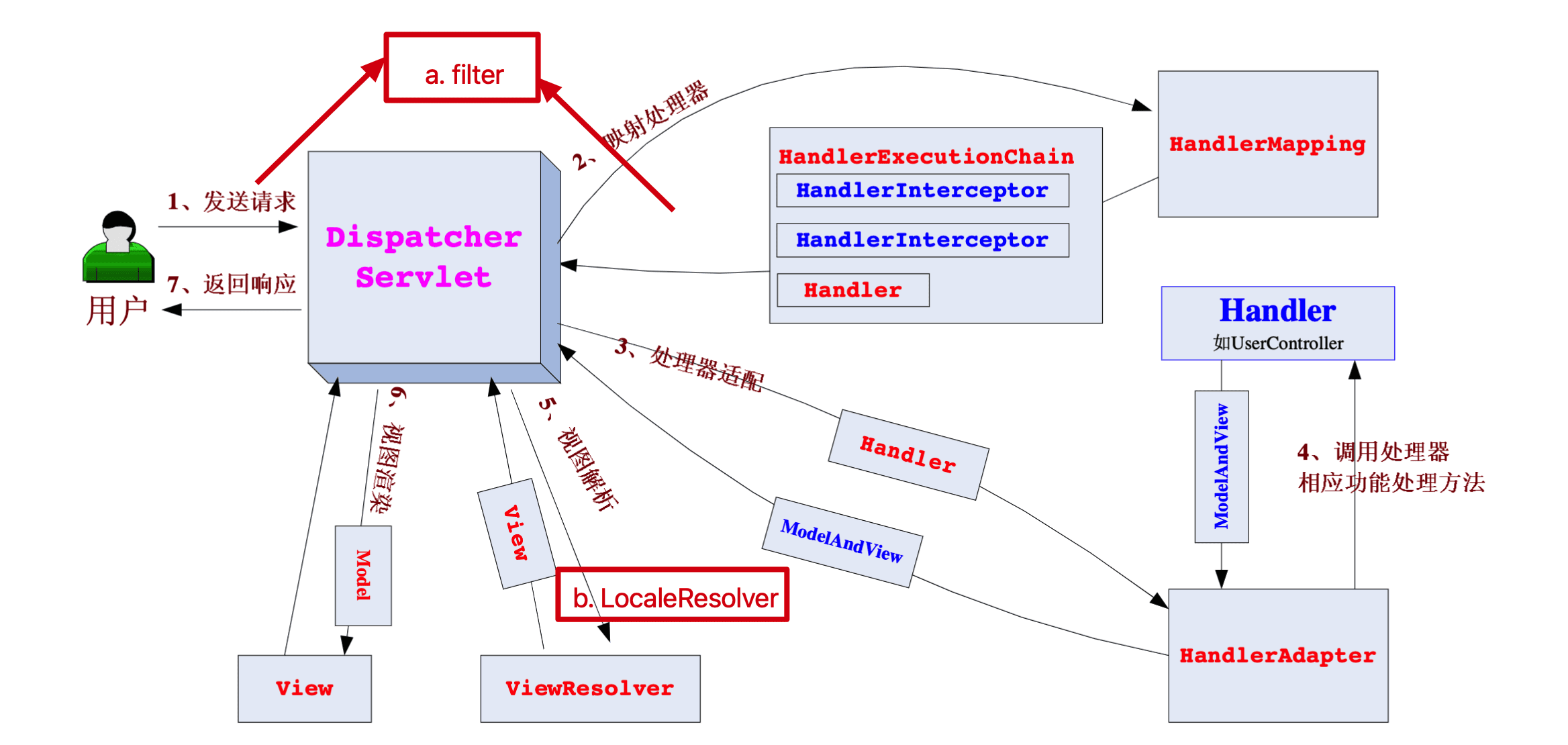 - HandlerAdapter—— >处理器功能处理方法的调用,HandlerAdapter 将会根据适配的结果调用真正的处理器的功能处 理方法,完成功能处理;并返回一个ModelAndView 对象(包含模型数据、逻辑视图名);