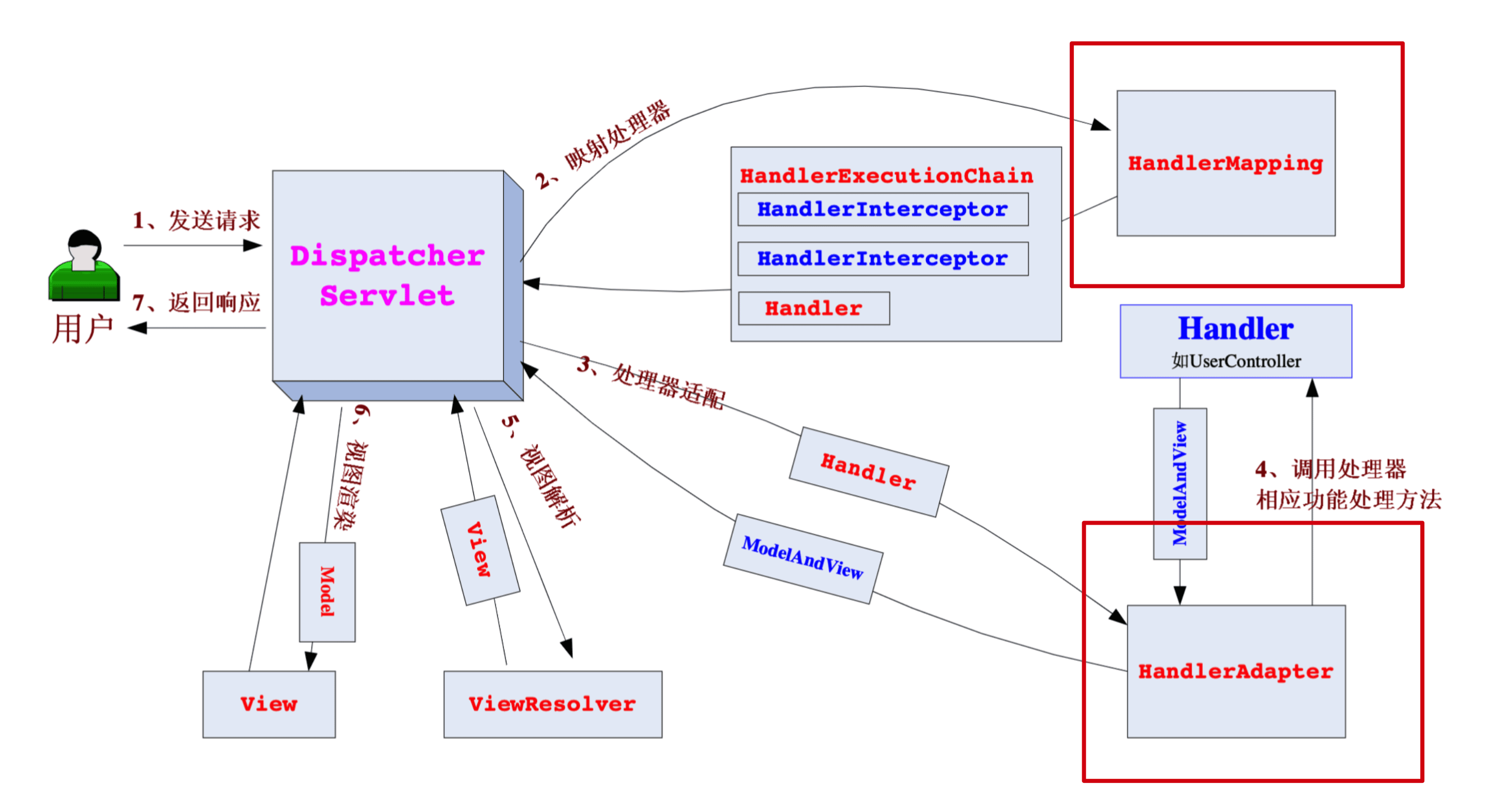 我们主要看initHandlerXXX相关的方法,它们之间的关系可以看SpringMVC的请求流程: