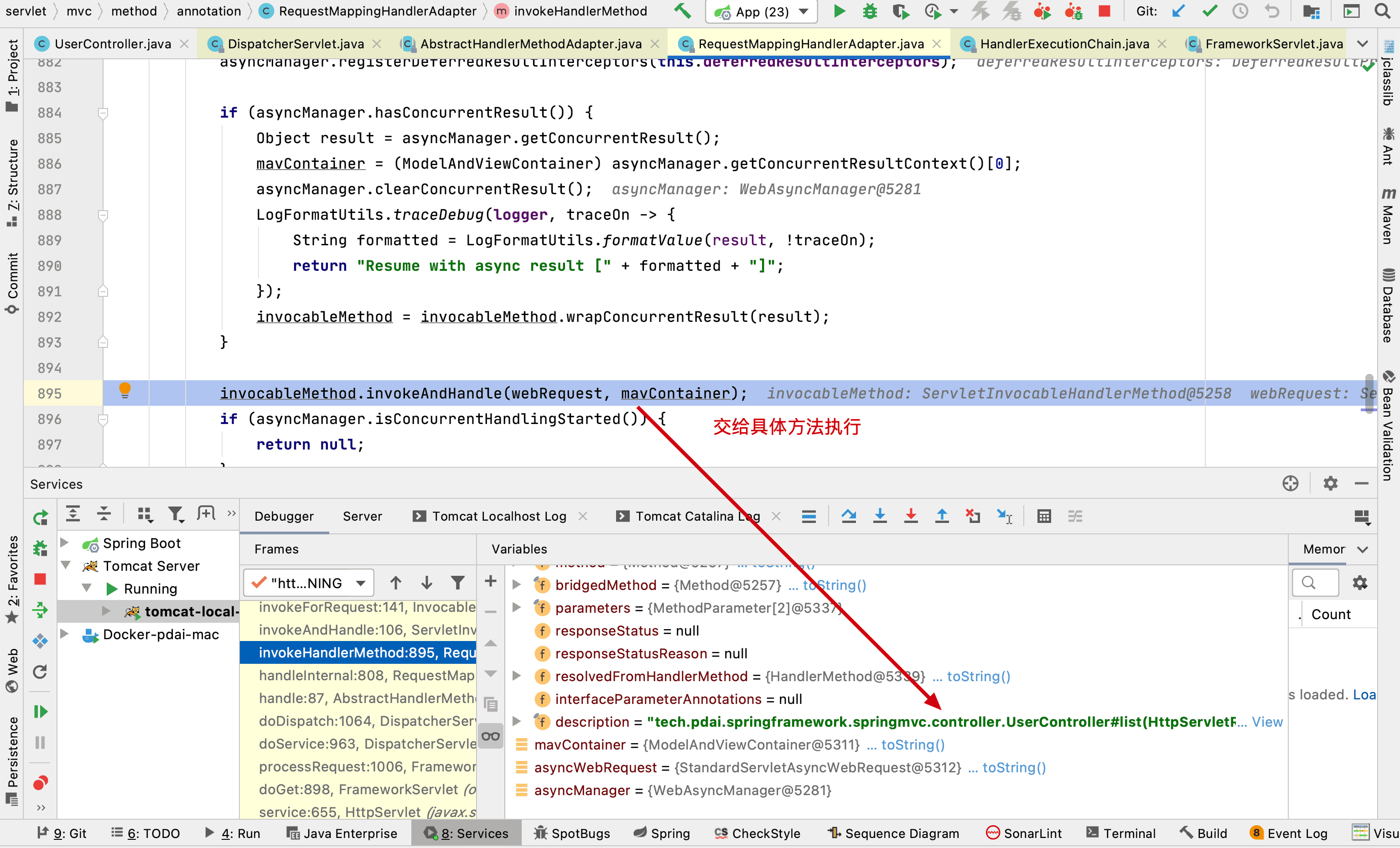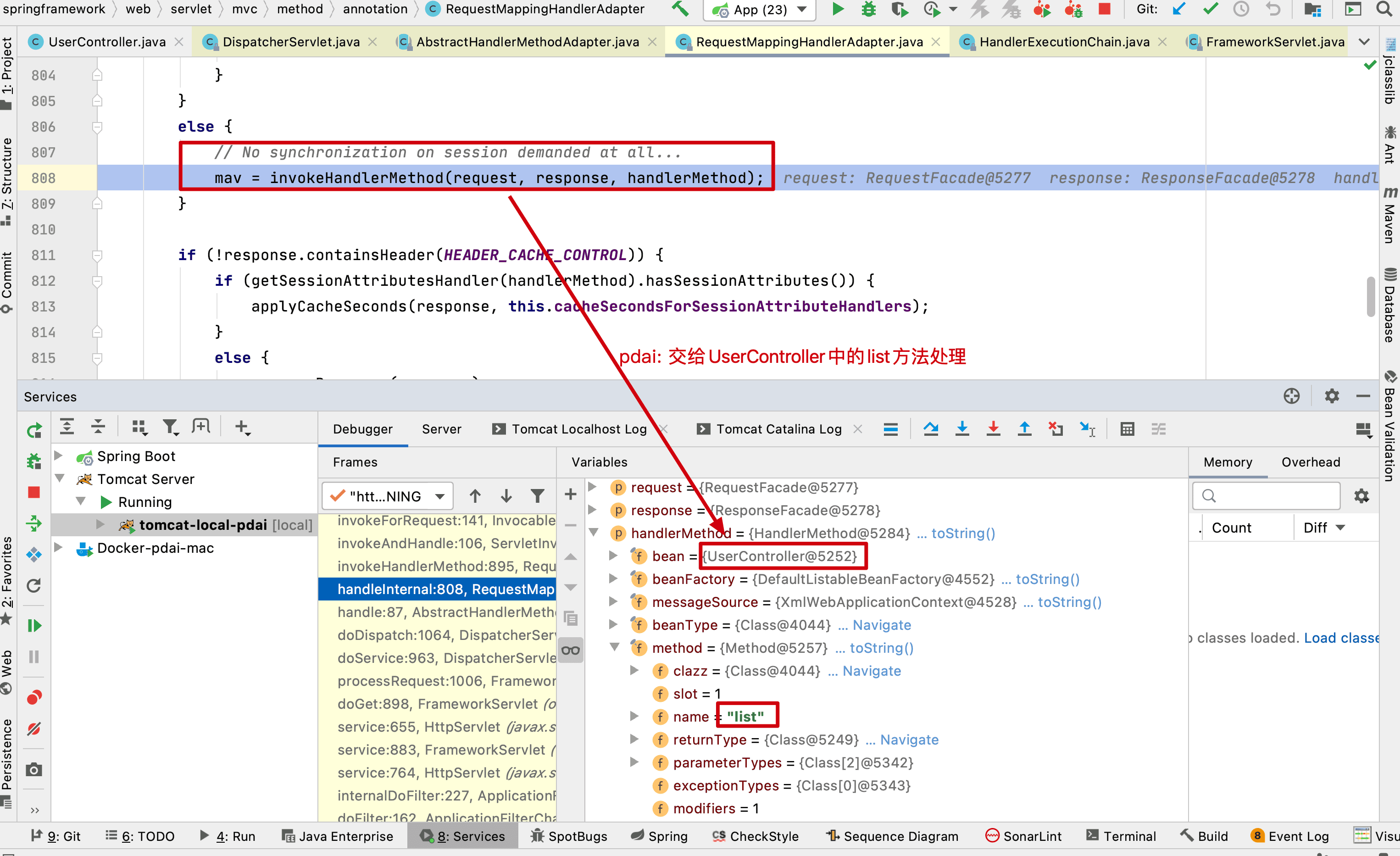 然后执行invokeHandlerMethod这个方法,用来对RequestMapping(usercontroller中的list方法)进行处理