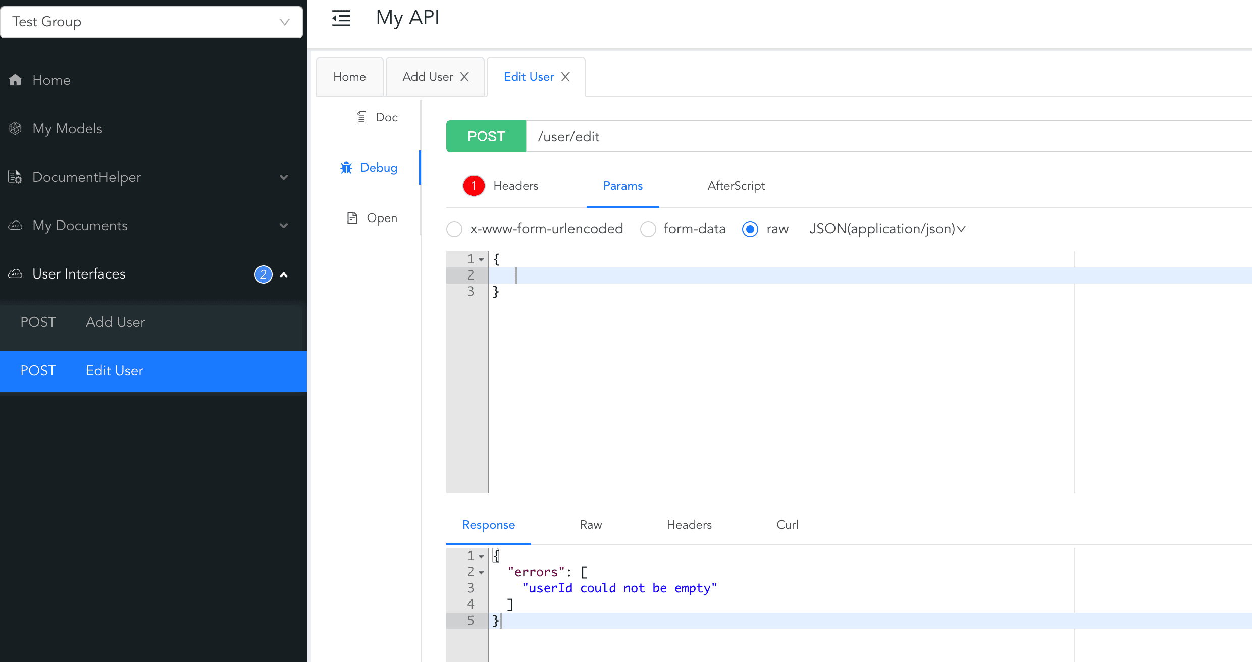 上面的例子中,其实存在一个问题,UserParam既可以作为addUser的参数(id为空),又可以作为updateUser的参数(id不能为空),这时候怎么办呢?分组校验登场。