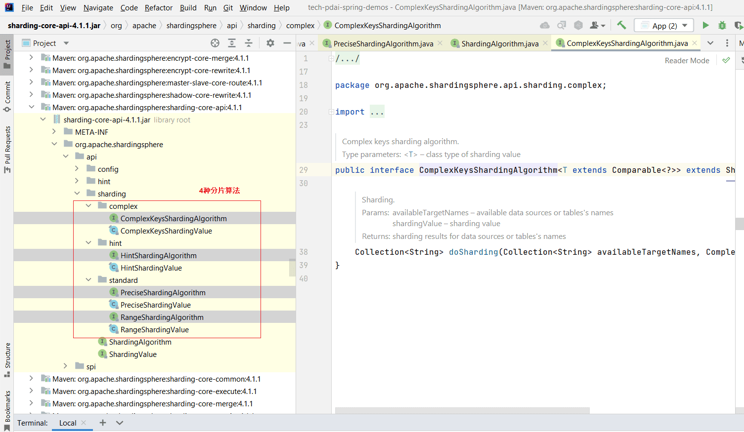 对应ComplexKeysShardingAlgorithm,用于处理使用多键作为分片键进行分片的场景,包含多个分片键的逻辑较复杂,需要应用开发者自行处理其中的复杂度。需要配合ComplexShardingStrategy使用。