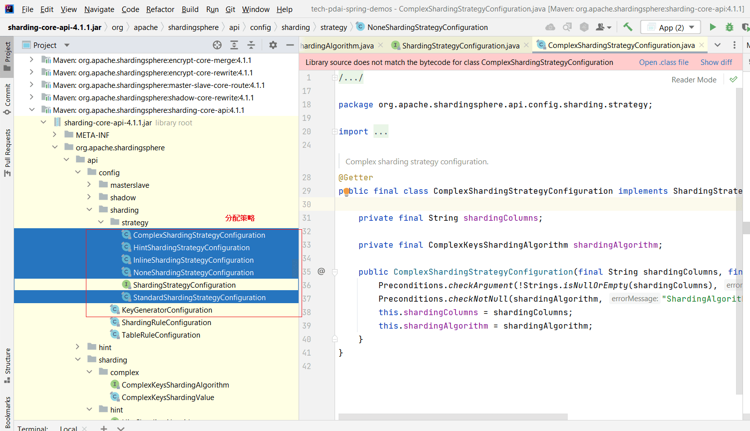 对应ComplexShardingStrategy。复合分片策略。提供对SQL语句中的=, >, <, >=, <=, IN和BETWEEN AND的分片操作支持。ComplexShardingStrategy支持多分片键,由于多分片键之间的关系复杂,因此并未进行过多的封装,而是直接将分片键值组合以及分片操作符透传至分片算法,完全由应用开发者实现,提供最大的灵活度。