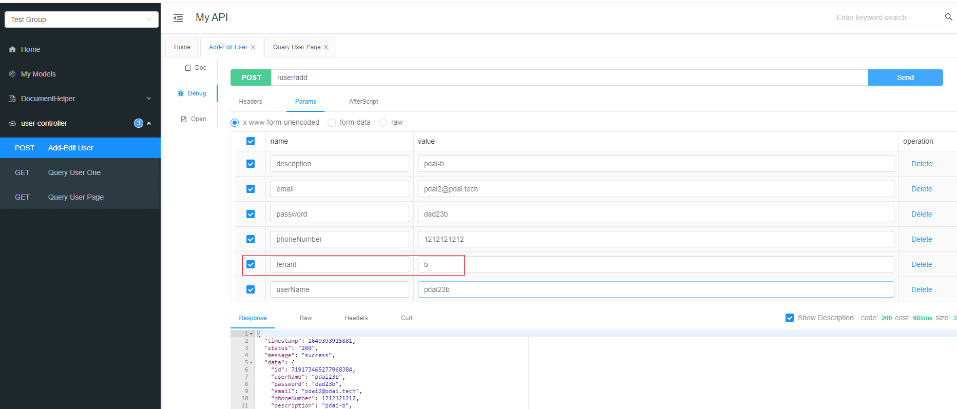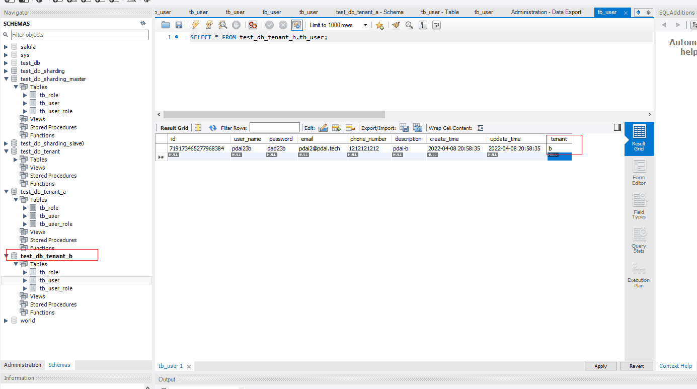 2022-04-08 20:58:35.755 INFO 8256 --- [nio-8080-exec-1] ShardingSphere-SQL : Actual SQL: tenant-b ::: insert into tb_user (create_time, description, email, password, phone_number, tenant, update_time, user_name, id) values (?, ?, ?, ?, ?, ?, ?, ?, ?) ::: [2022-04-08 20:58:35.323, anarkh-b, anarkh2@anarkh.tech, dad23b, 1212121212, b, 2022-04-08 20:58:35.323, anarkh23b, 719173465277968384]