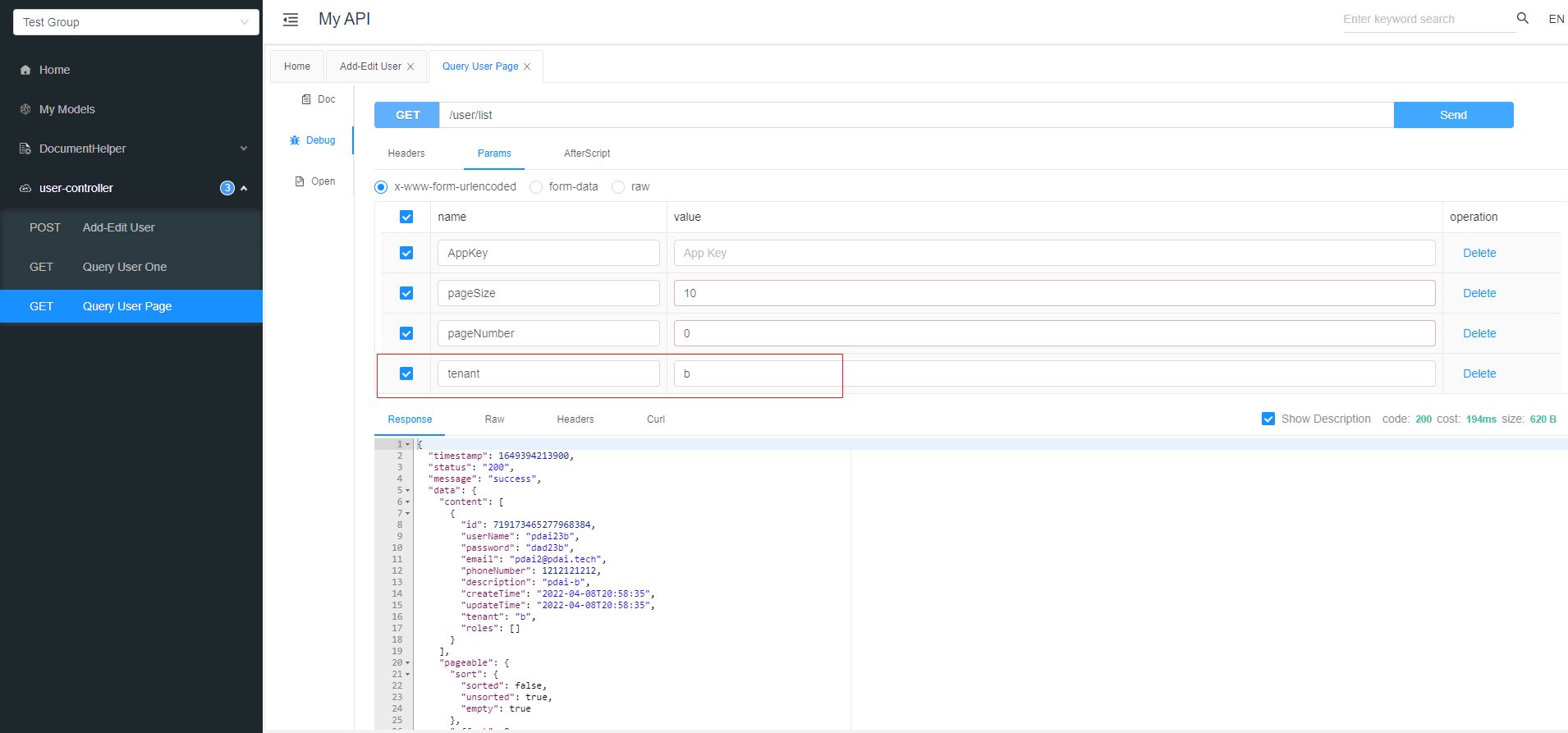 2022-04-08 21:03:33.877 INFO 8256 --- [nio-8080-exec-2] ShardingSphere-SQL : Actual SQL: tenant-b ::: select user0_.id as id1_1_, user0_.create_time as create_t2_1_, user0_.description as descript3_1_, user0_.email as email4_1_, user0_.password as password5_1_, user0_.phone_number as phone_nu6_1_, user0_.tenant as tenant7_1_, user0_.update_time as update_t8_1_, user0_.user_name as user_nam9_1_ from tb_user user0_ where user0_.tenant=? limit ? ::: [b, 10]