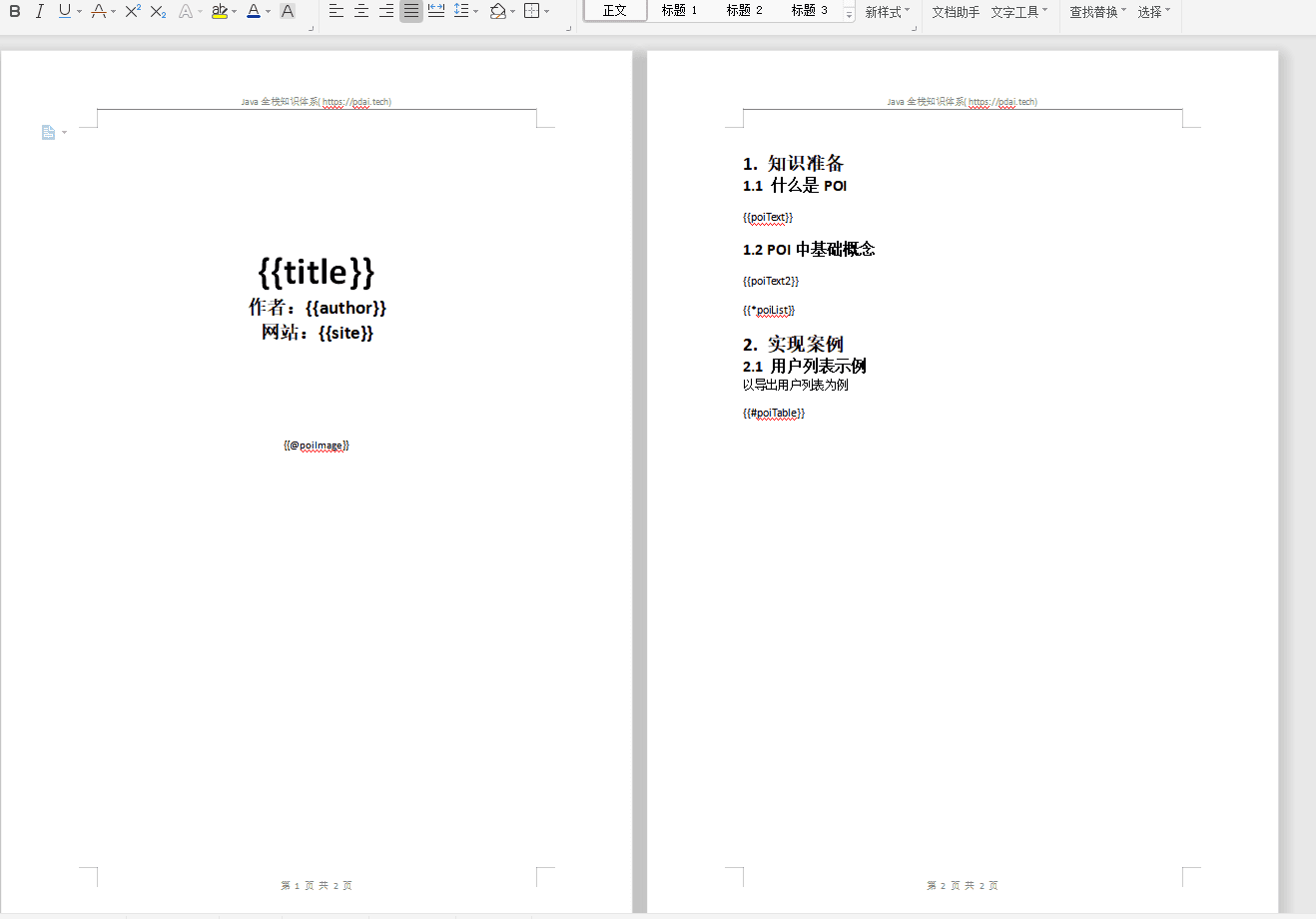 模板是Docx格式的Word文档,你可以使用Microsoft office、WPS Office、Pages等任何你喜欢的软件制作模板,也可以使用Apache POI代码来生成模板。