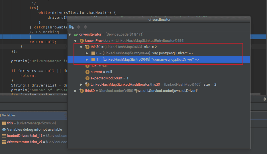 可以看到此时迭代器中有两个驱动,mysql和postgresql的都被加载了。
