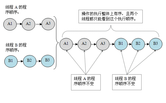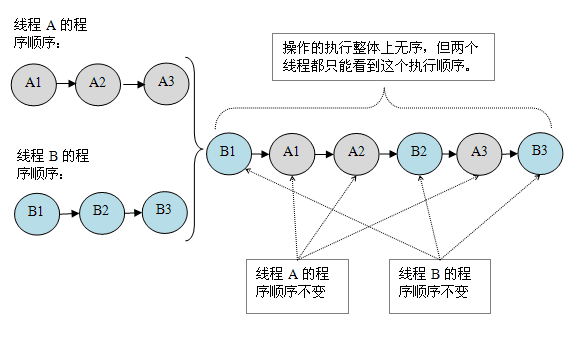 - 如果程序是正确同步的,程序的执行将具有顺序一致性(sequentially consistent)-- 即程序的执行结果与该程序在顺序一致性内存模型中的执行结果相同(马上我们将会看到,这对于程序员来说是一个极强的保证)。这里的同步是指广义上的同步,包括对常用同步原语(lock,volatile 和 final)的正确使用。