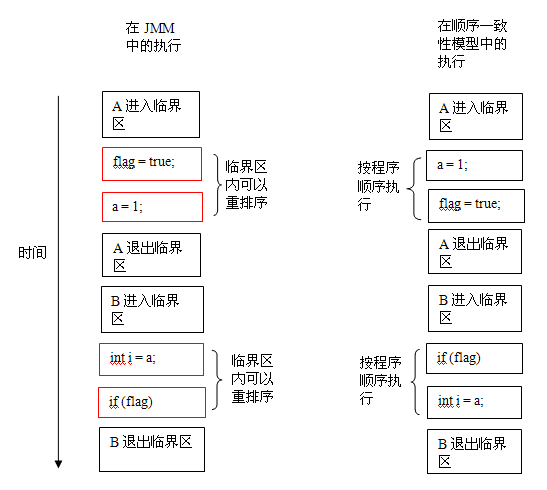 }上面示例代码中,假设 A 线程执行 writer() 方法后,B 线程执行 reader() 方法。这是一个正确同步的多线程程序。根据 JMM 规范,该程序的执行结果将与该程序在顺序一致性模型中的执行结果相同。下面是该程序在两个内存模型中的执行时序对比图:
