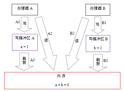 这里处理器 A 和处理器 B 可以同时把共享变量写入自己的写缓冲区(A1,B1),然后从内存中读取另一个共享变量(A2,B2),最后才把自己写缓存区中保存的脏数据刷新到内存中(A3,B3)。当以这种时序执行时,程序就可以得到 x = y = 0 的结果。