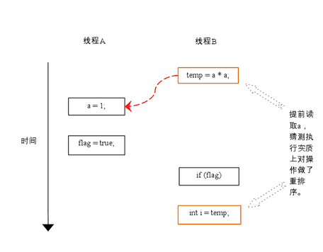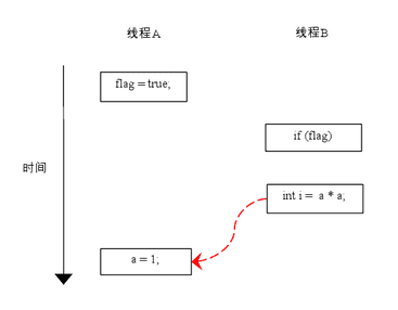 如上图所示,操作 1 和操作 2 做了重排序。程序执行时,线程 A 首先写标记变量 flag,随后线程 B 读这个变量。由于条件判断为真,线程 B 将读取变量 a。此时,变量 a 还根本没有被线程 A 写入,在这里多线程程序的语义被重排序破坏了!