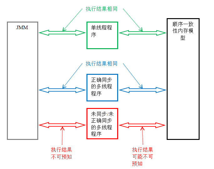 - 正确同步的多线程程序。正确同步的多线程程序的执行将具有顺序一致性(程序的执行结果与该程序在顺序一致性内存模型中的执行结果相同)。这是 JMM 关注的重点,JMM 通过限制编译器和处理器的重排序来为程序员提供内存可见性保证。