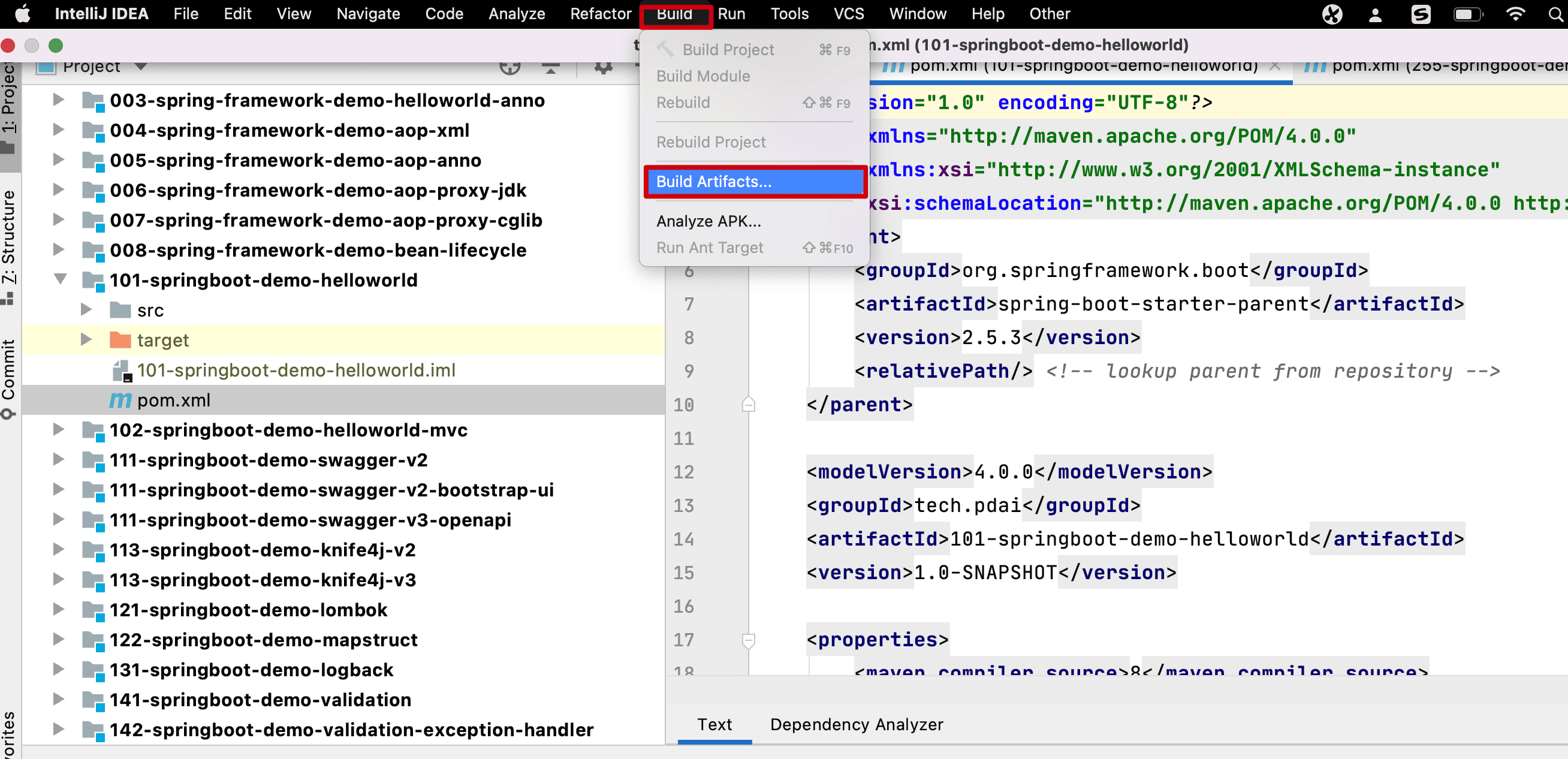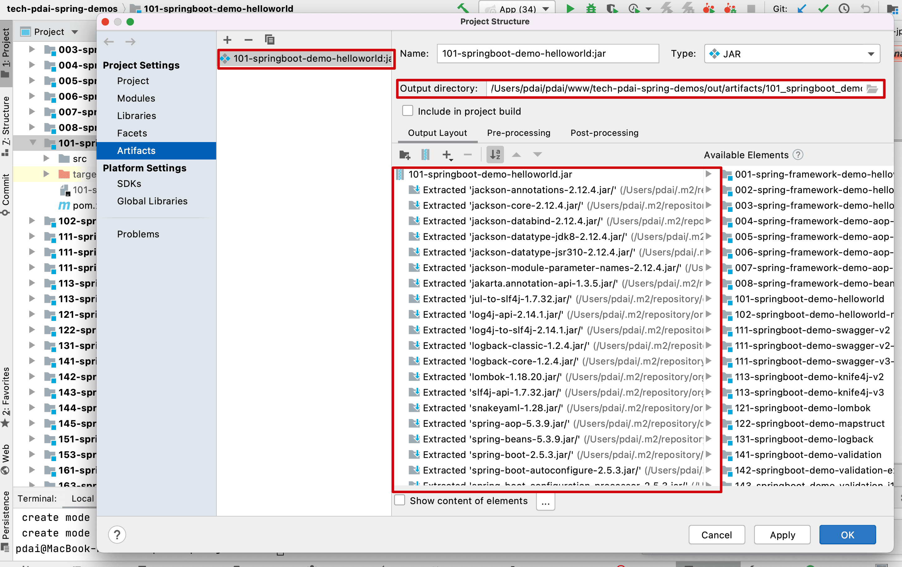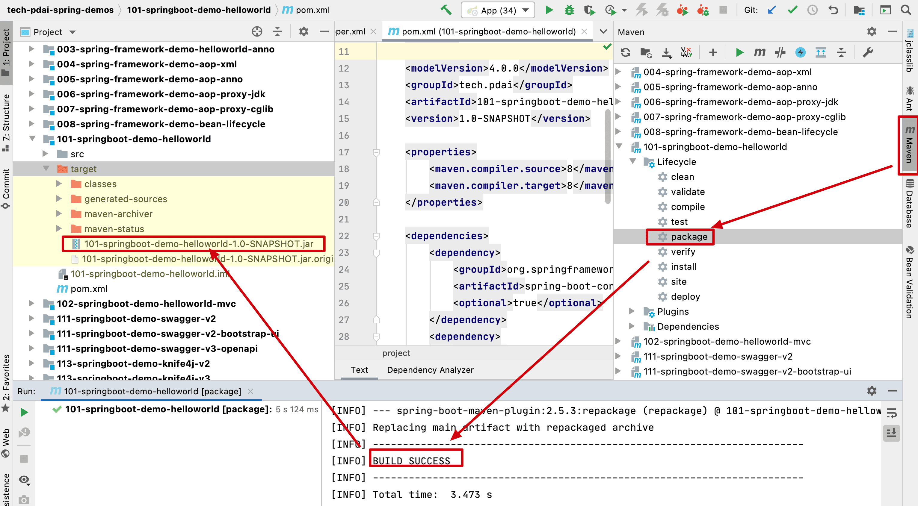 这里以一个Helloworld项目(SpringBoot入门 - 创建第一个Hello world工程)为例打包成jar。