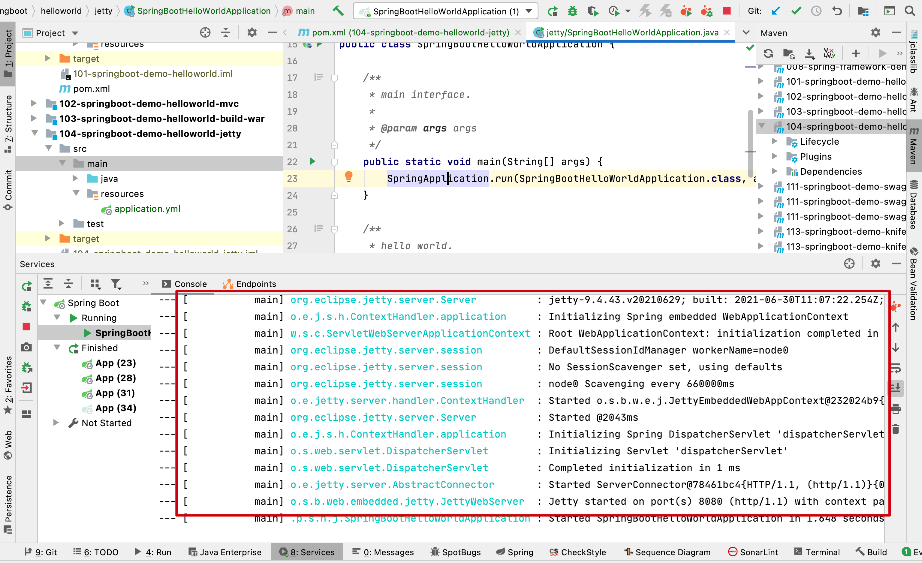 2022-04-18  21:09:21.749  INFO 54806 --- [           main] .p.s.h.j.SpringBootHelloWorldApplication : Starting SpringBootHelloWorldApplication using Java 1.8.0_181 on MacBook-Pro.local with PID 54806 (/Users/anarkh/anarkh/www/tech-anarkh-spring-demos/104-springboot-demo-helloworld-jetty/target/classes started by anarkh in /Users/anarkh/anarkh/www/tech-anarkh-spring-demos)