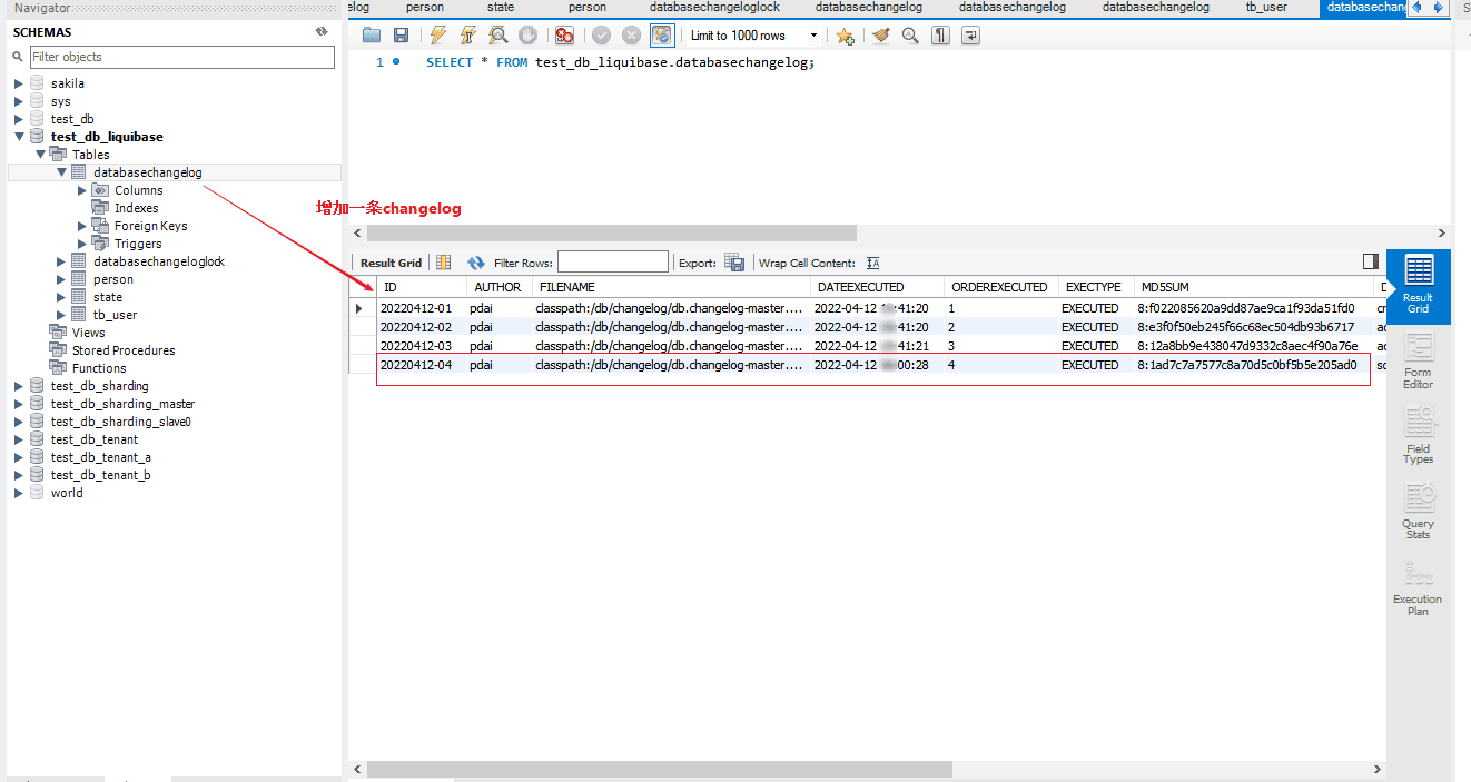 很显然,因为databasechangelog表中已经有相关执行记录了,所以将不再执行变更
