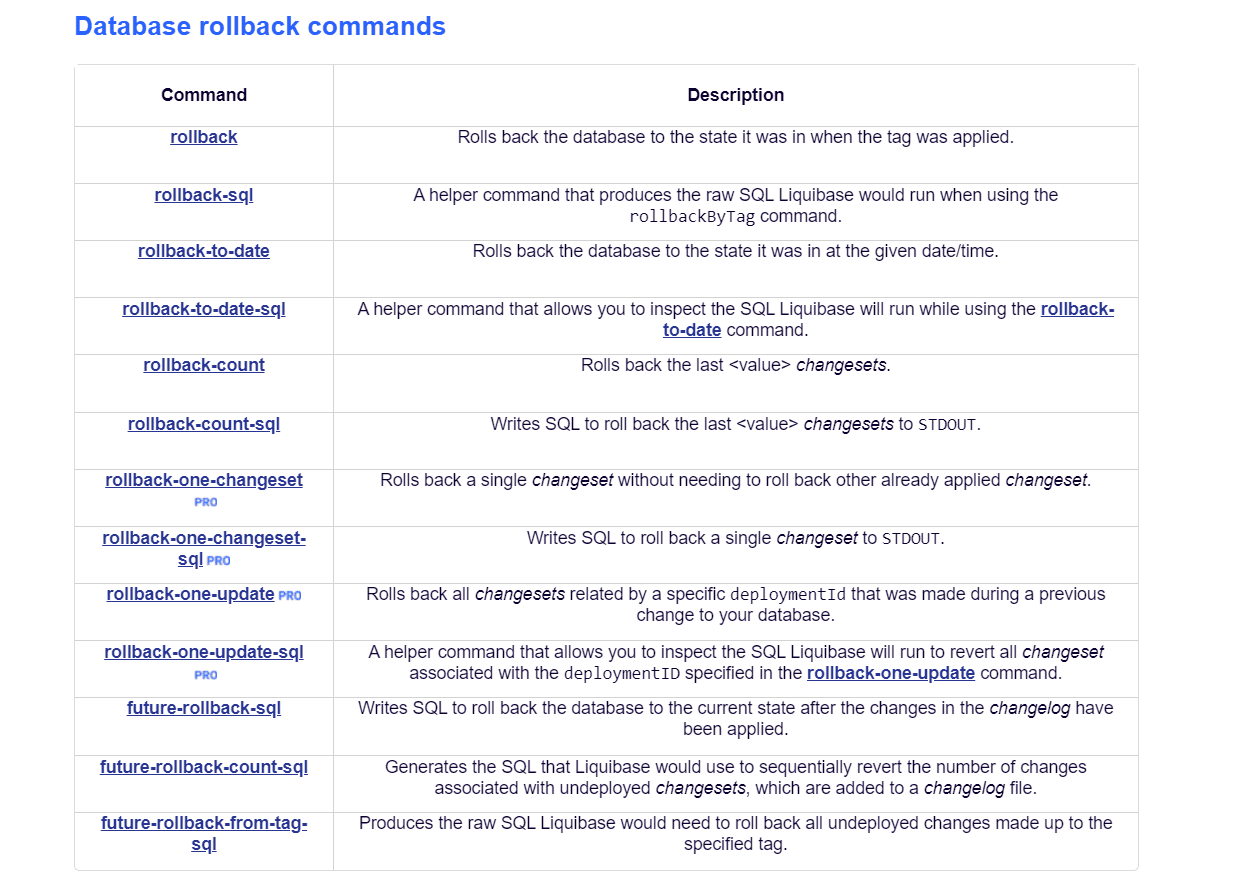 • 提供变化应用的回滚功能,可按时间、数量或标签(tag)回滚已应用的变化。通过这种方式,开发人员可轻易的还原数据库在任何时间点的状态