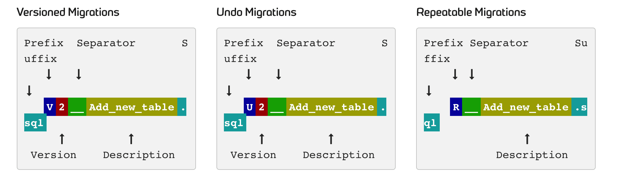 - 前缀: V 代表版本变迁(Versioned Migrations), U 代表撤销变迁(Undo Migrations), R 代表可重复变迁(Repeatable Migrations)