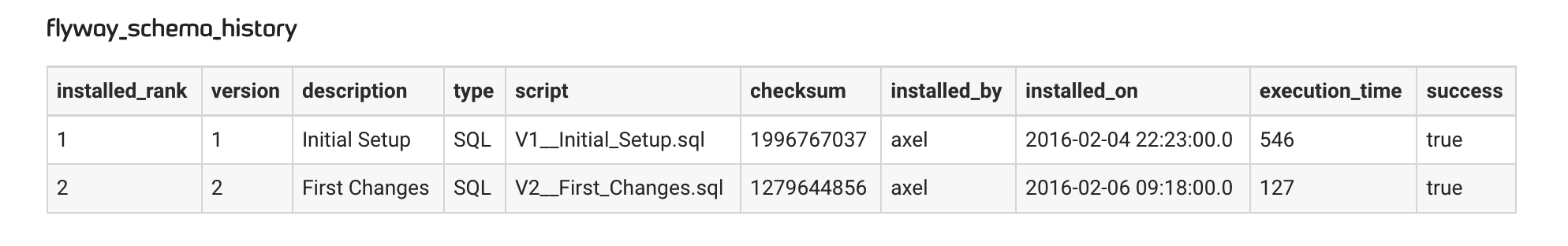 2022-04-13 07:56:56.245 INFO 86030 --- [ main] o.f.c.i.s.JdbcTableSchemaHistory : Creating Schema History table `test_db_flyway`.`flyway_schema_history` ...