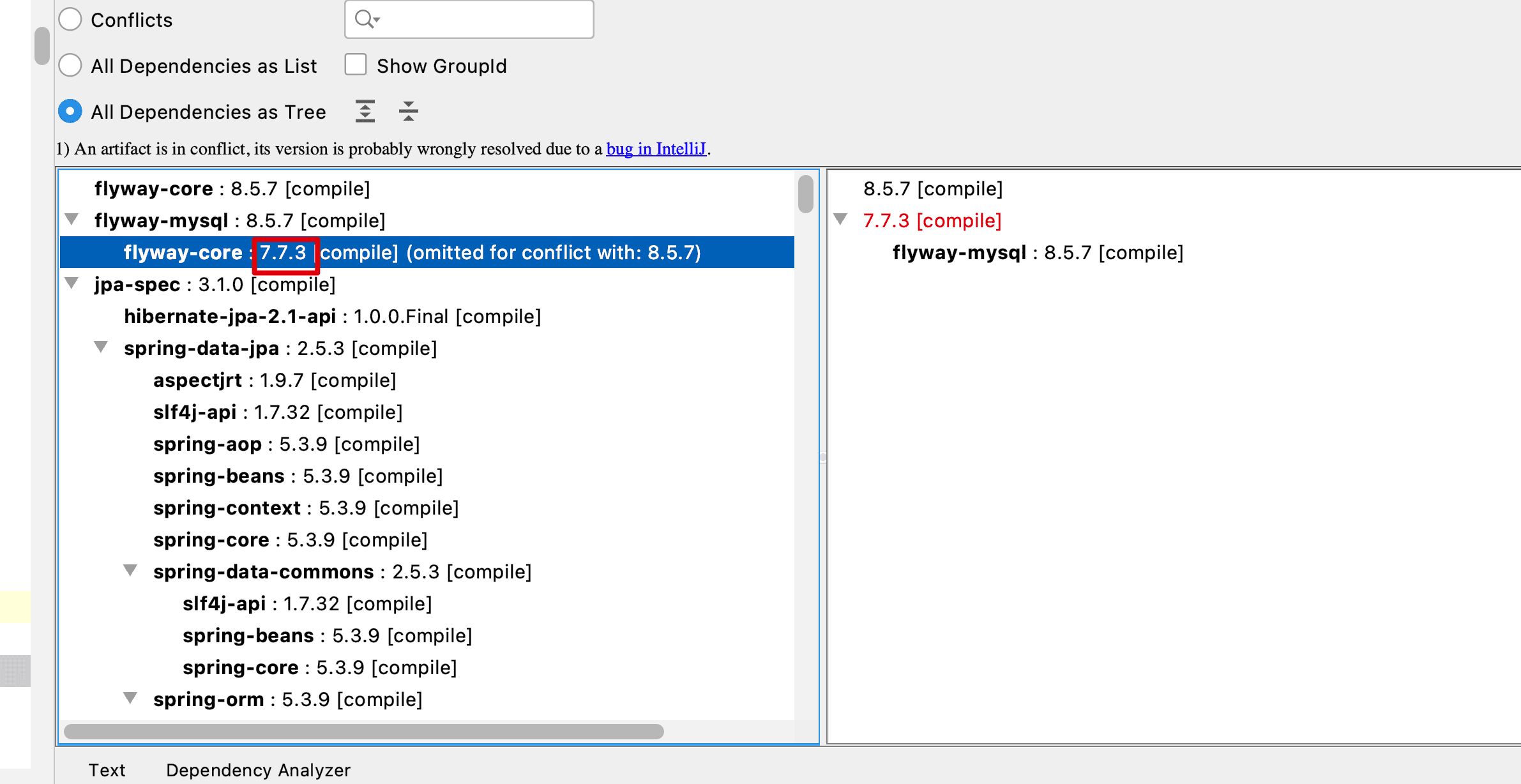 所以你应该引入的包是flyway-mysql:8.5.7,而有意思的是这个包中包含的flyway-core版本是7.7.3