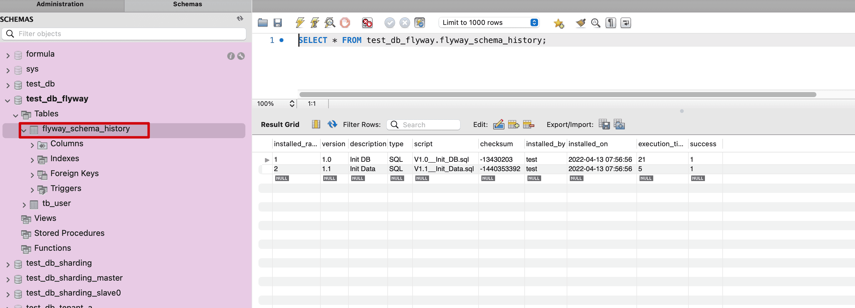 2022-04-13 07:56:56.346 INFO 86030 --- [ main] o.f.core.internal.command.DbMigrate : Successfully applied 2 migrations to schema `test_db_flyway`, now at version v1.1 (execution time 00:00.058s)生成的flyway更新的记录,test_db_flyway.flyway_schema_history